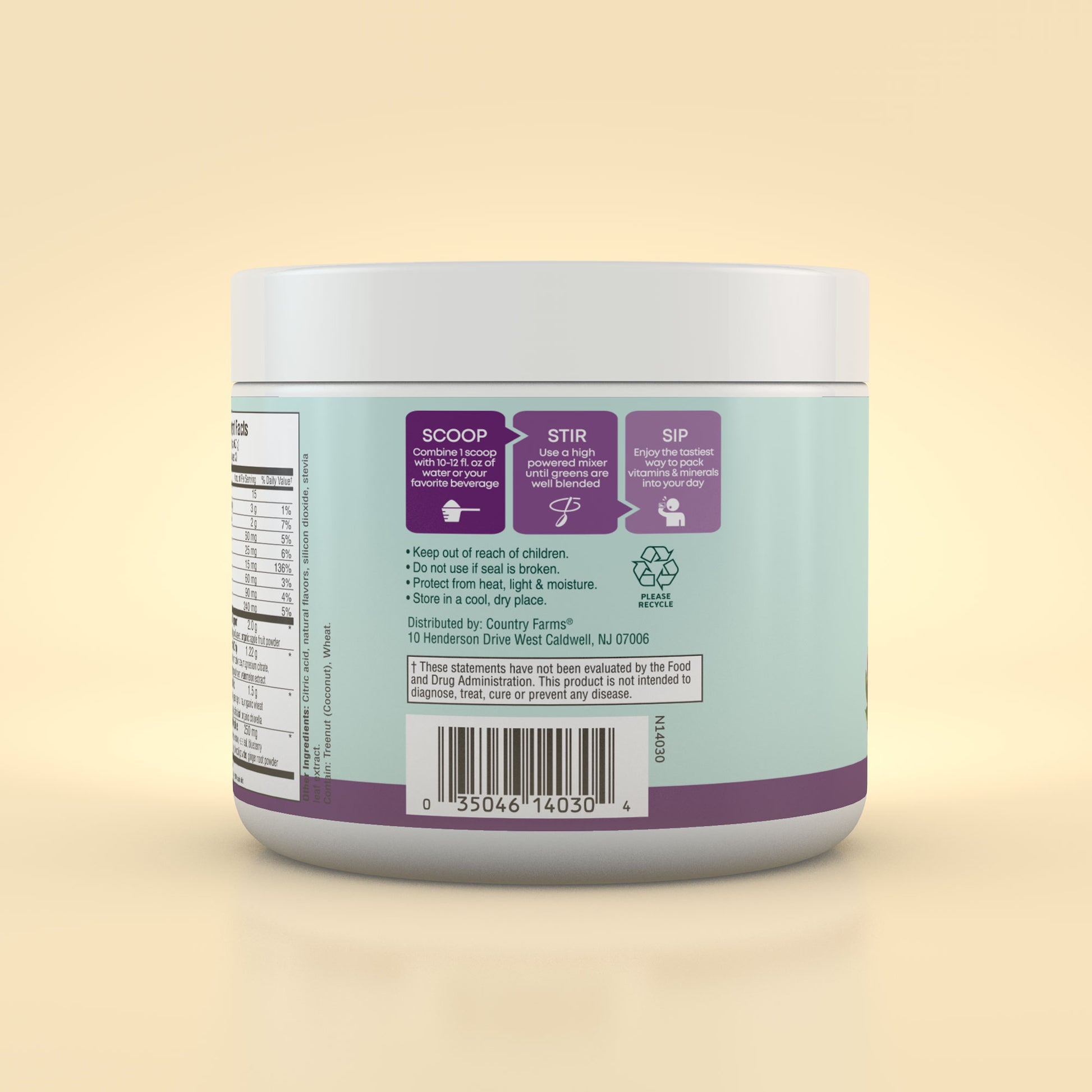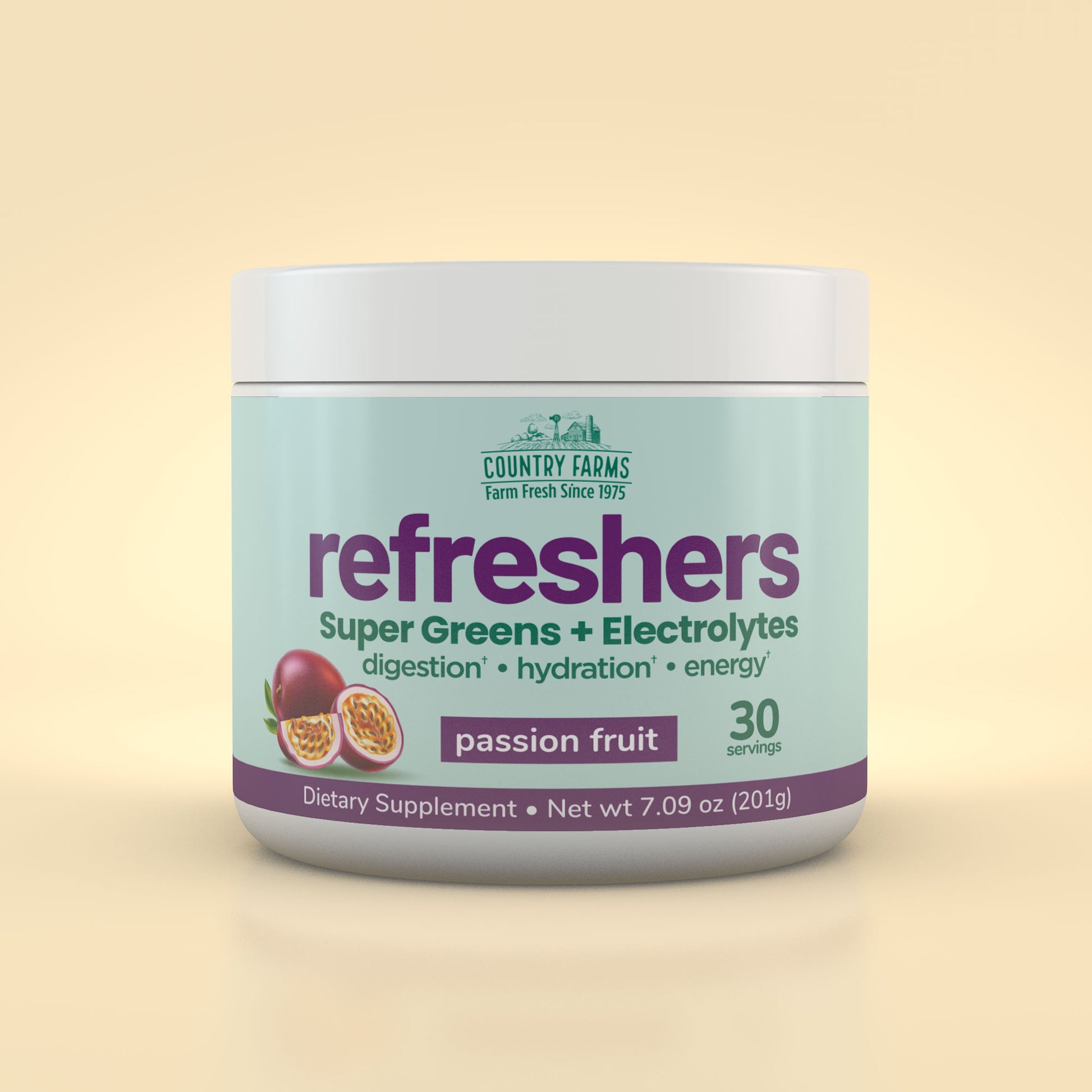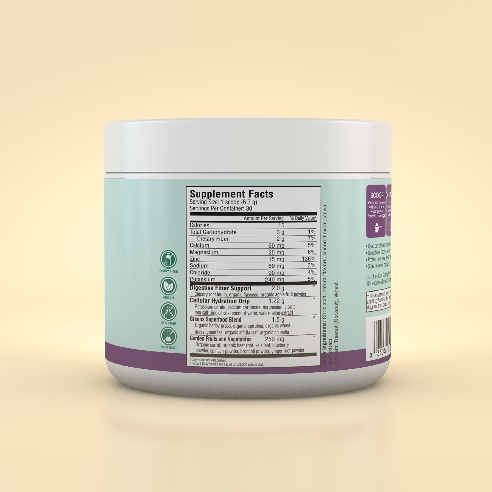 In addition to its potent hydration formula, Country Farms Refreshers provides an essential blend of greens, fruits, vegetables and superfoods in every serving. Just mix 1 scoop of Refreshers powder in water and you’ll benefit from organic barley grass, spirulina, green tea and wheat grass, along with organic carrots and beet root. Also included is a fiber blend of chicory root, organic flaxseed and organic apple to enhance proper digestion.