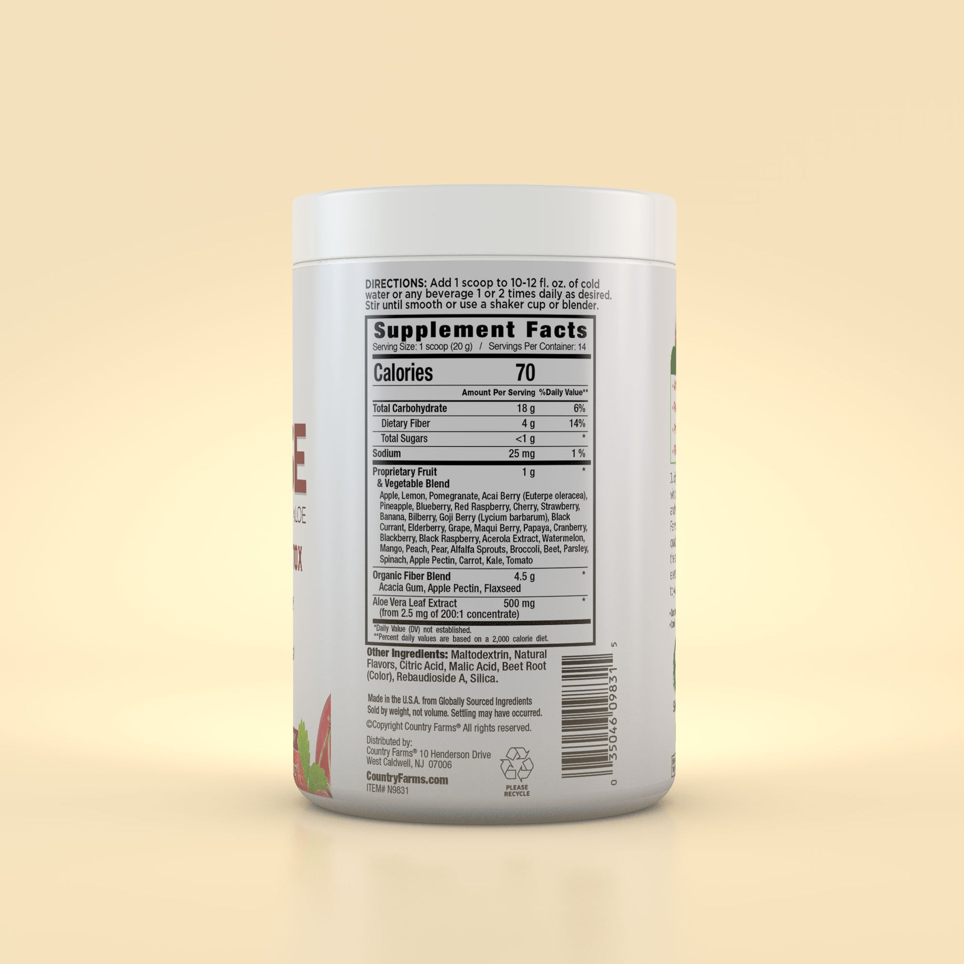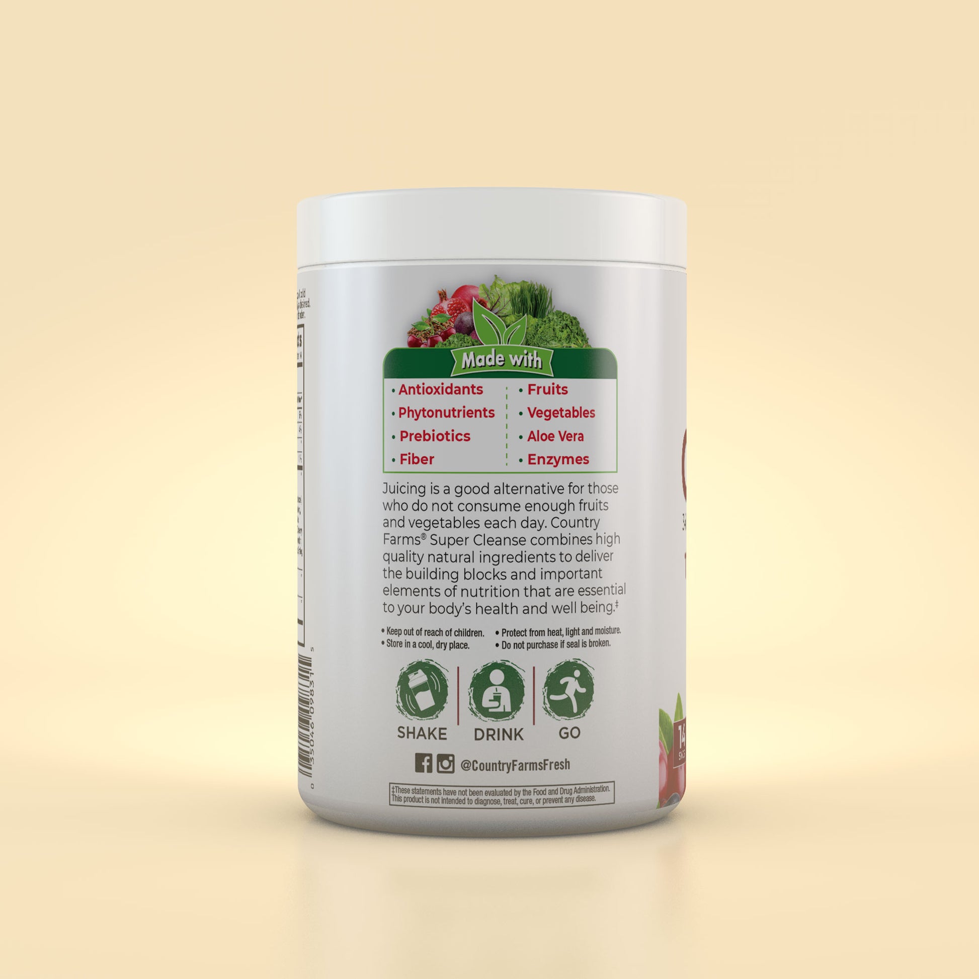 Country Farms Super Cleanse is a delicious, berry-flavored powder drink bursting with vital superfoods. This fruit and vegetable blend includes blueberry, raspberry, goji, acai, kale, tomato and more! The formula's high antioxidant level may support energy levels and rejuvenate the body.