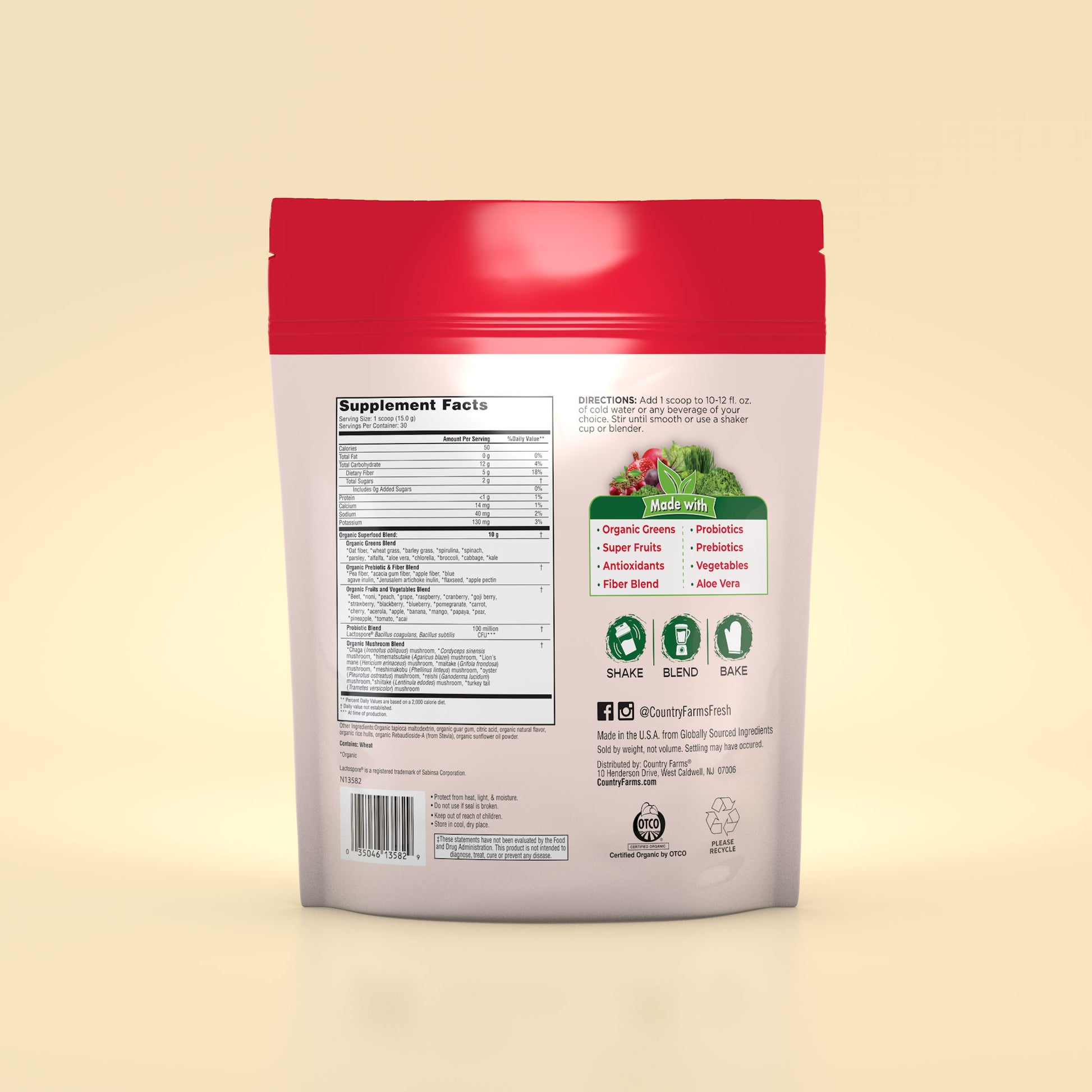 Fortunately, each low-calorie serving of Country Farms Super Greens drink mix contains 50 organic fruits, vegetables, greens, grasses and mushrooms, plus probiotics and prebiotic fiber. Super Greens boast vitamins, minerals, antioxidants, phytonutrients and enzymes necessary to support optimal health. Our Super Greens Powder Drink Mix offers wholesome farm-to-table nutrition at your convenience.