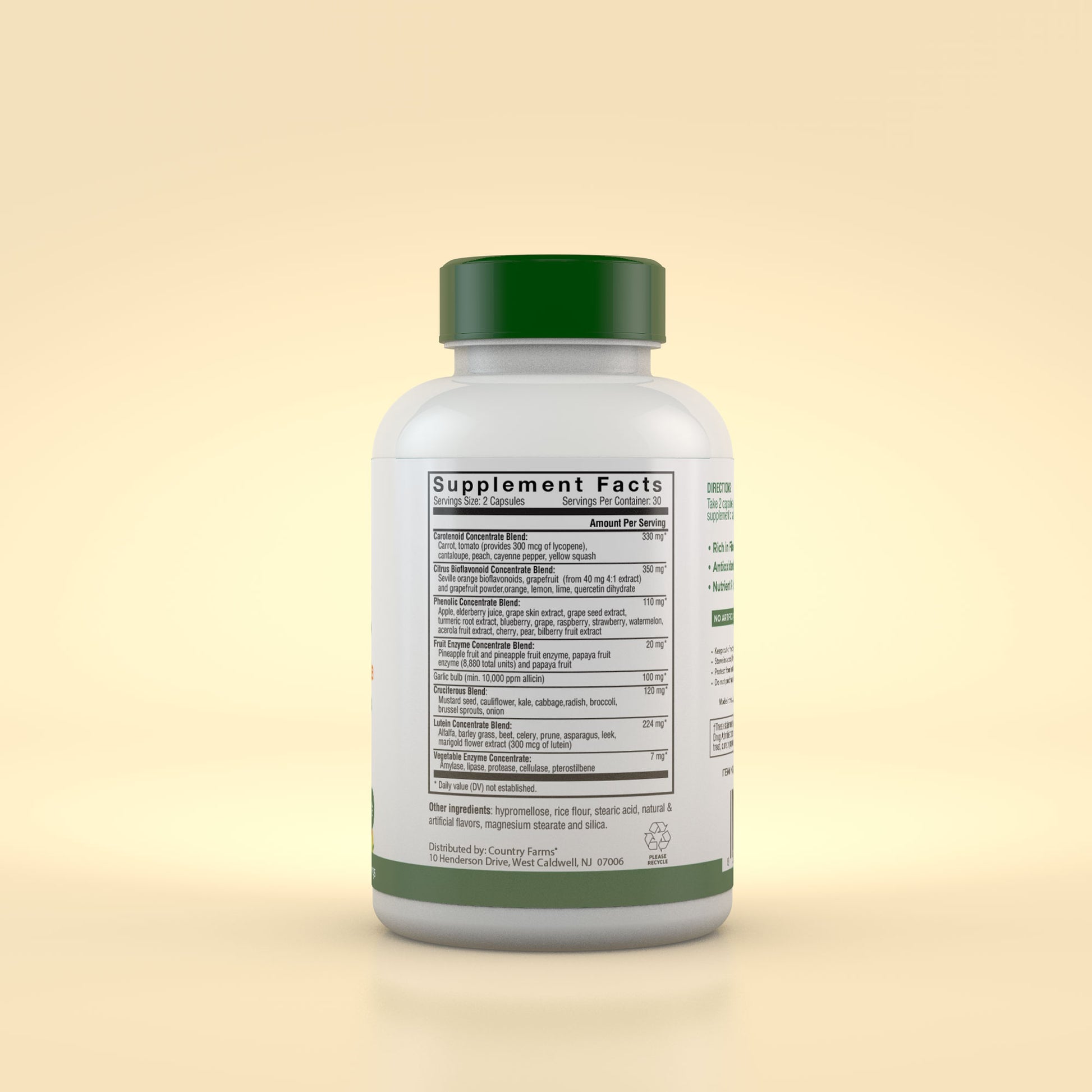 Country Farms Super Greens Vegicaps are a whole foods supplement, each containing a powerhouse of numerous superfoods! This alkalizing formula, includes wheat grass, kale, barley, mixed berries and other fruits and vegetables to support overall health and digestion. These capsules were designed because even the most health-conscious people sometimes find it challenging to consume the right number of superfoods they need. That's why these capsules take the guesswork out of the equation, leaving you with the amazing nutritional needs your body craves.